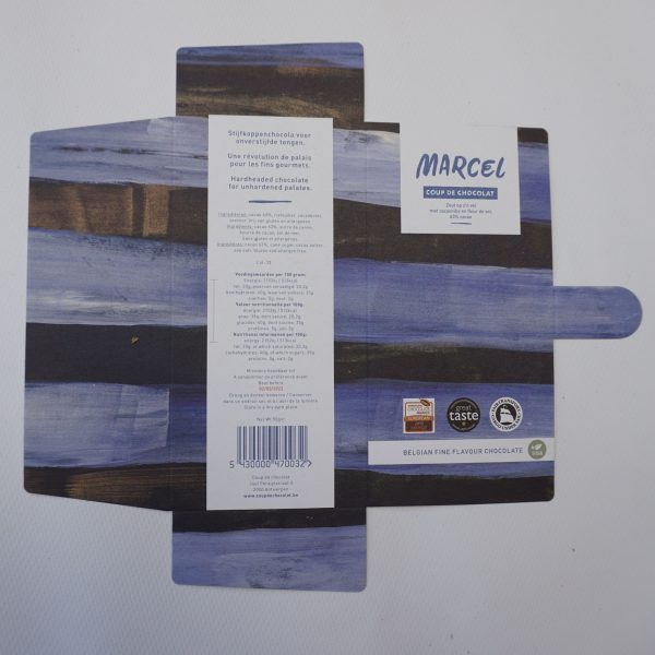 This creamy Marcel has salt on his skin. The fleur de sel and the roasted cocoa beans that are sprinkled on it give it a punch and crunch that the cocoa percentage of 63% does not suggest.