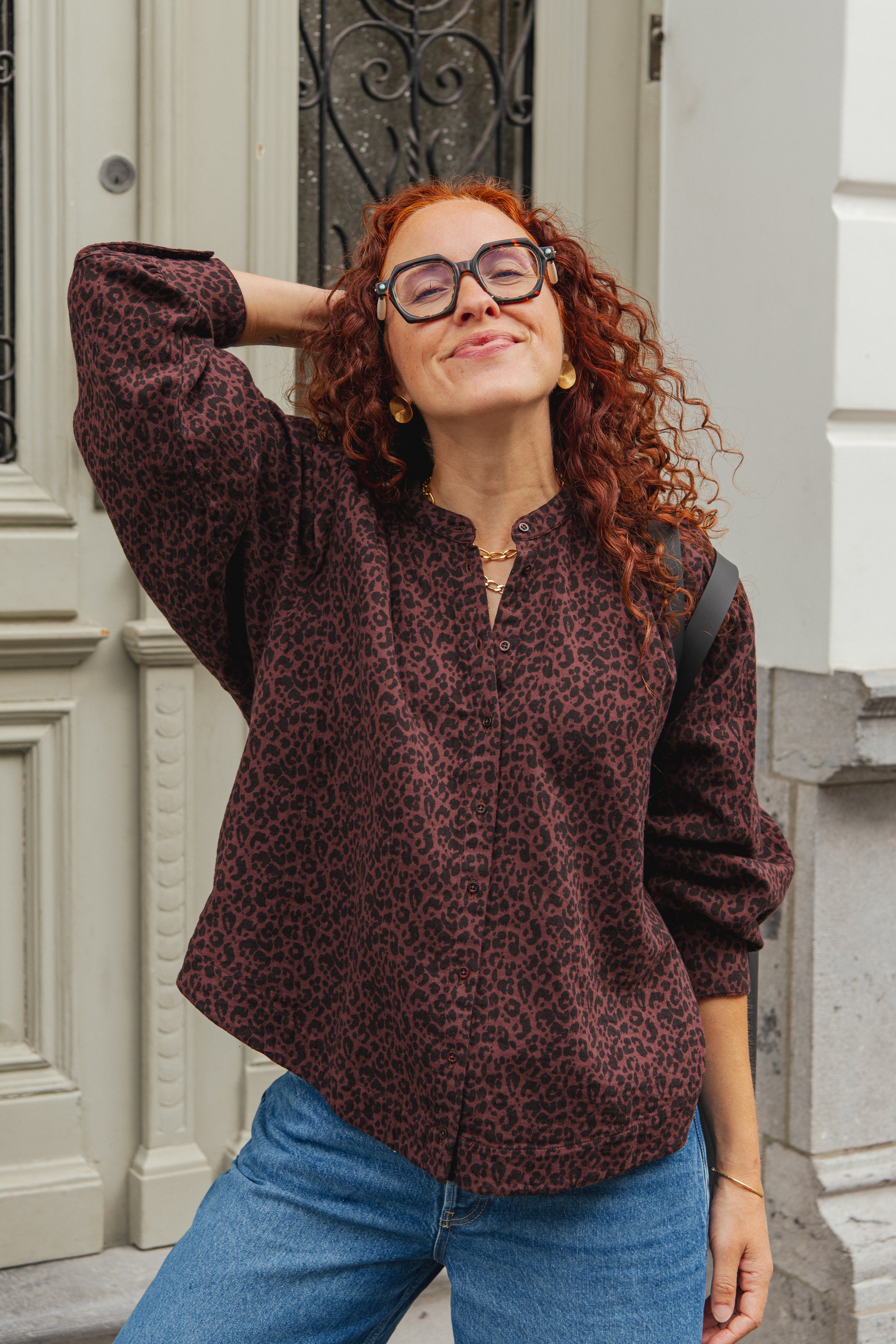 Stunning boxy blouse with a subtle leopard print! Wide and slightly cropped fit, with a black and reddish brown print. We LOVE the details on the shoulders!