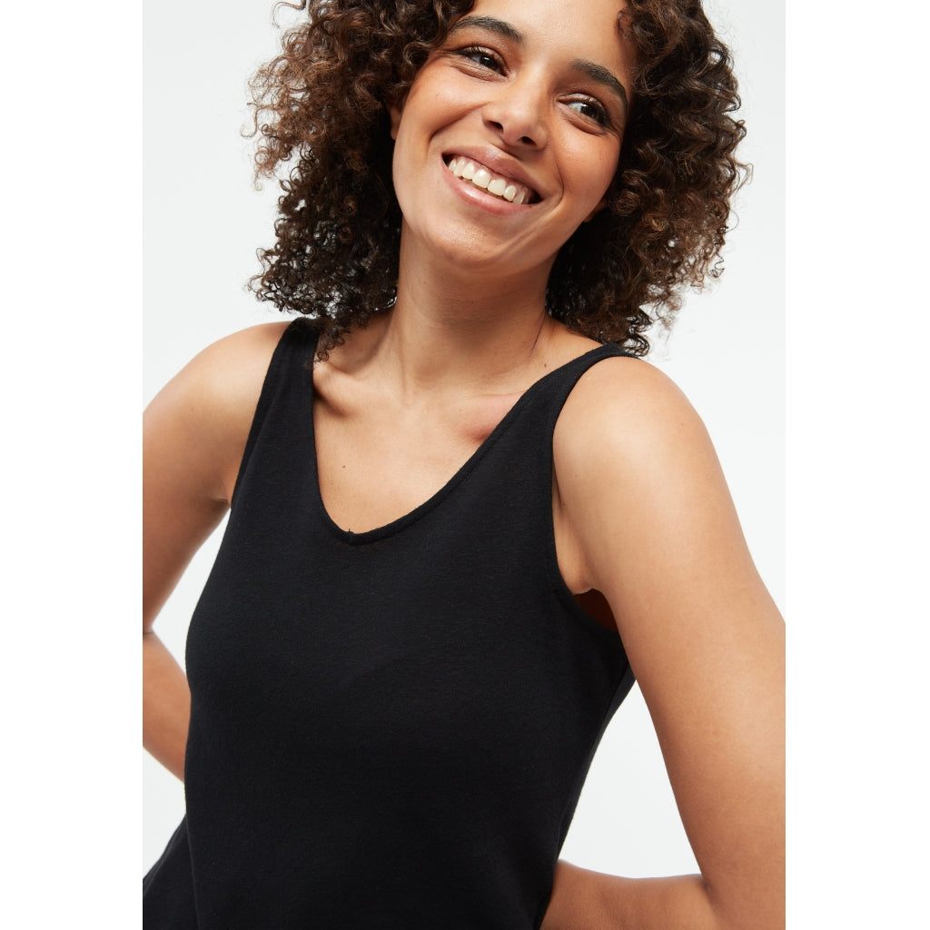 Jette is a loose sleeveless top with a V-neck. The light, soft cotton-linen fabric is pleasantly airy on the skin. You can combine this top with any shorts or skirt for a feminine summery look.
