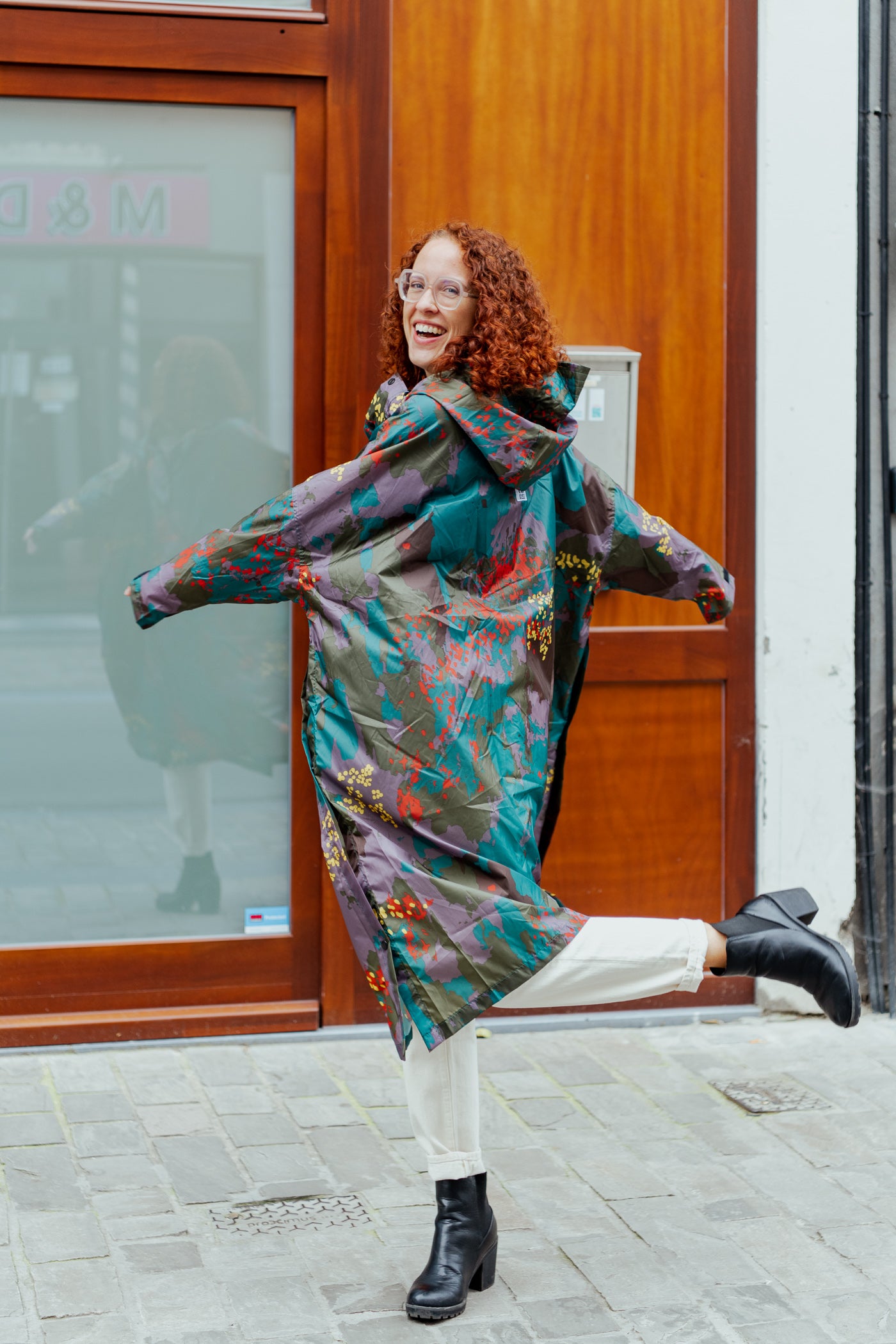 Make every rainy day a long walk in the woods. Burnt orange, pale yellows and cool teals blend with calming earth tones. This bold 7 colour print has an outspoken look that keeps your dry and your mind calm. A futuristic design that embraces the serenity of the forest through a digital landscape.